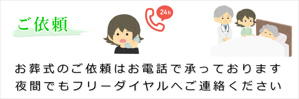 | 葬儀のご依頼は24時間365日承っております。病院や施設でご逝去の場合は、医師による死亡確認がされた段階でお電話ください。速やかに寝台車を配車致します。ご自宅で看取られた場合は、夜間でも直ちにご自宅へお伺い致します。外出先やご自宅で突然のご逝去の場合、警察の指示に従いながらご連絡ください。状況にあわせたお手伝いをさせて頂きます。 |