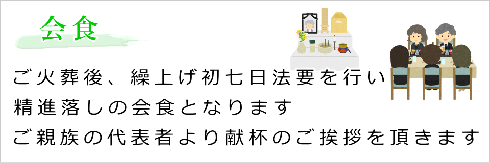| ご火葬終了後式場へ戻り、繰上げ初七日法要を行います。法要後は故人様を偲びながらのご会食となります。(繰上げ初七日法要を告別式に組み込んだ場合は、式場へお戻り後すぐにご会食となります。)ご遺骨がご自宅へお帰りになられた後の祭壇や仏具もプランに含まれています。これらは四十九日法要(ご納骨)までお使い頂けます。またお客様特典のアフターサービスとして、仏壇や本位牌の販売、墓所、墓石の情報提供、香典返し、海洋散骨の手配、税務相談などをご用意しております。ご相談ください。 |